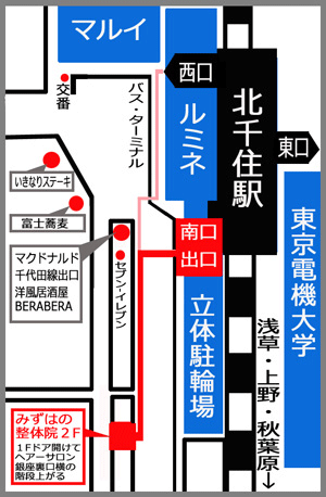 北千住仲町口前徒歩1分・交通はJR常磐線、地下鉄日比谷線、千代田線・つくばEX・東武伊勢崎線・都営バス交通【北千住駅下車】をご利用ください。【専用駐車場はございません】