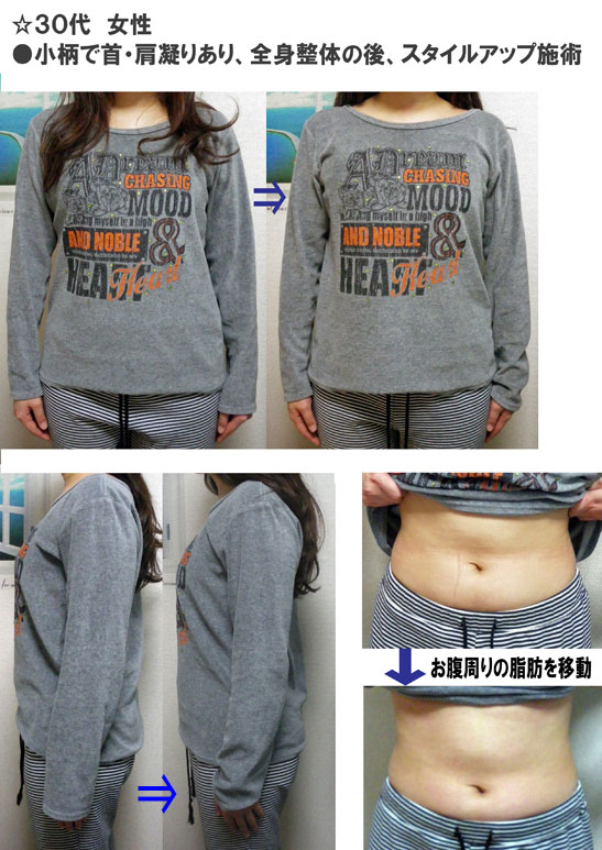 通常の整体に加えて特定の筋肉の締めと緩み、 さらに余分な箇所の脂肪の移動によって女性のスタイルを短時間で キレイにカッ コ良く変化させる当院の新しい手技です。 詳細は下のビフォー、アフター画像をご覧ください 継続して施す事により無理なく、お腹周りの脂肪を移動させるために胴体にくびれが形成されていきます。 是非、全身整体と合 わせて計80分、計110分のスタイルアップ施術をご体験ください。